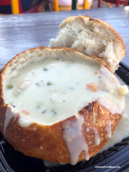 This isjust as good as it sounds, and was probably one of our team’s top five from the Disneyland holiday eats checklists! Creamy, super-flavorful turkey chowder included big chunks of turkey and lots of veggies. It really tasted like the inside of a pot pie. As always, not only is the soup a winner, but that house-made sourdough bread bowl is the perfect complement.