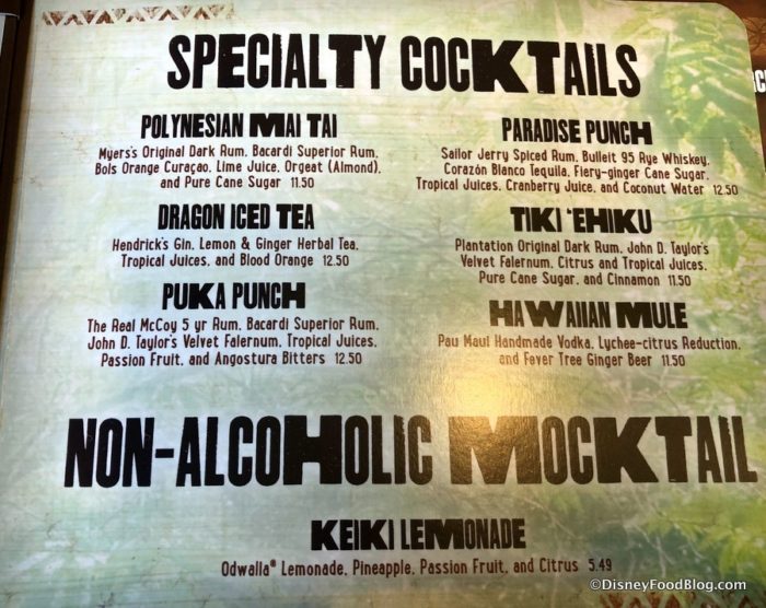 Specialty Cocktails also include the Polynesian Mai Tai and Puka Punch, while the Keiki Lemonade is the featured Mocktail.