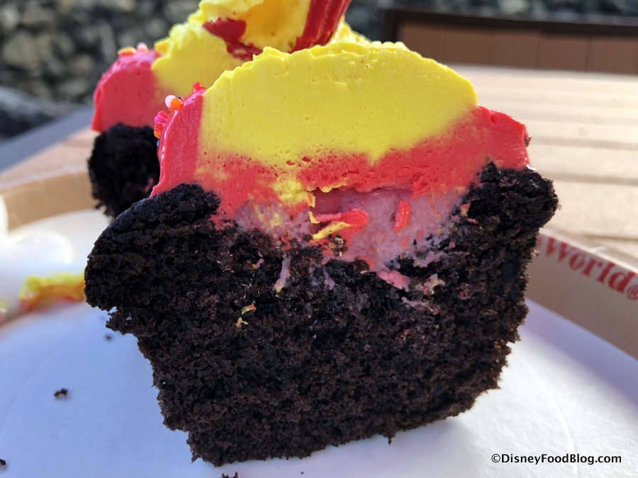 Mickey’s Birthday Cupcake is topped with a yellow-colored vanilla buttercream… and a mini “cupcake”!