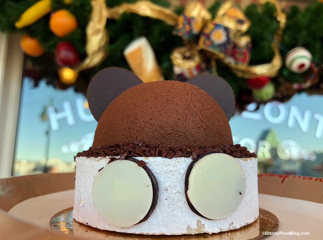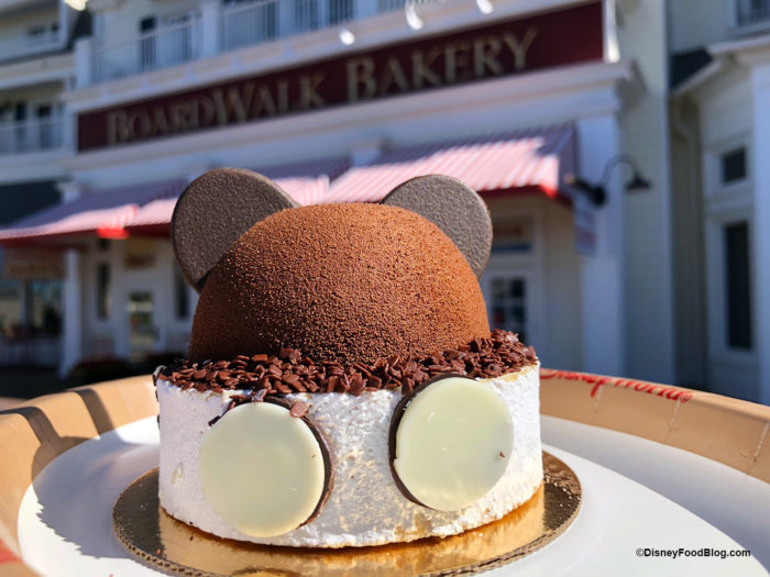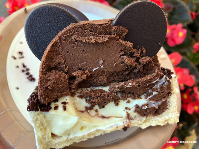 You’ve got a white chocolate custard tart as a base, and it is topped off with a perfectly rounded serving of dark chocolate mousse making the dome shape. Then it’s garnished with chocolate ears, a tail, and of course Mickey’s recognizable buttons!
