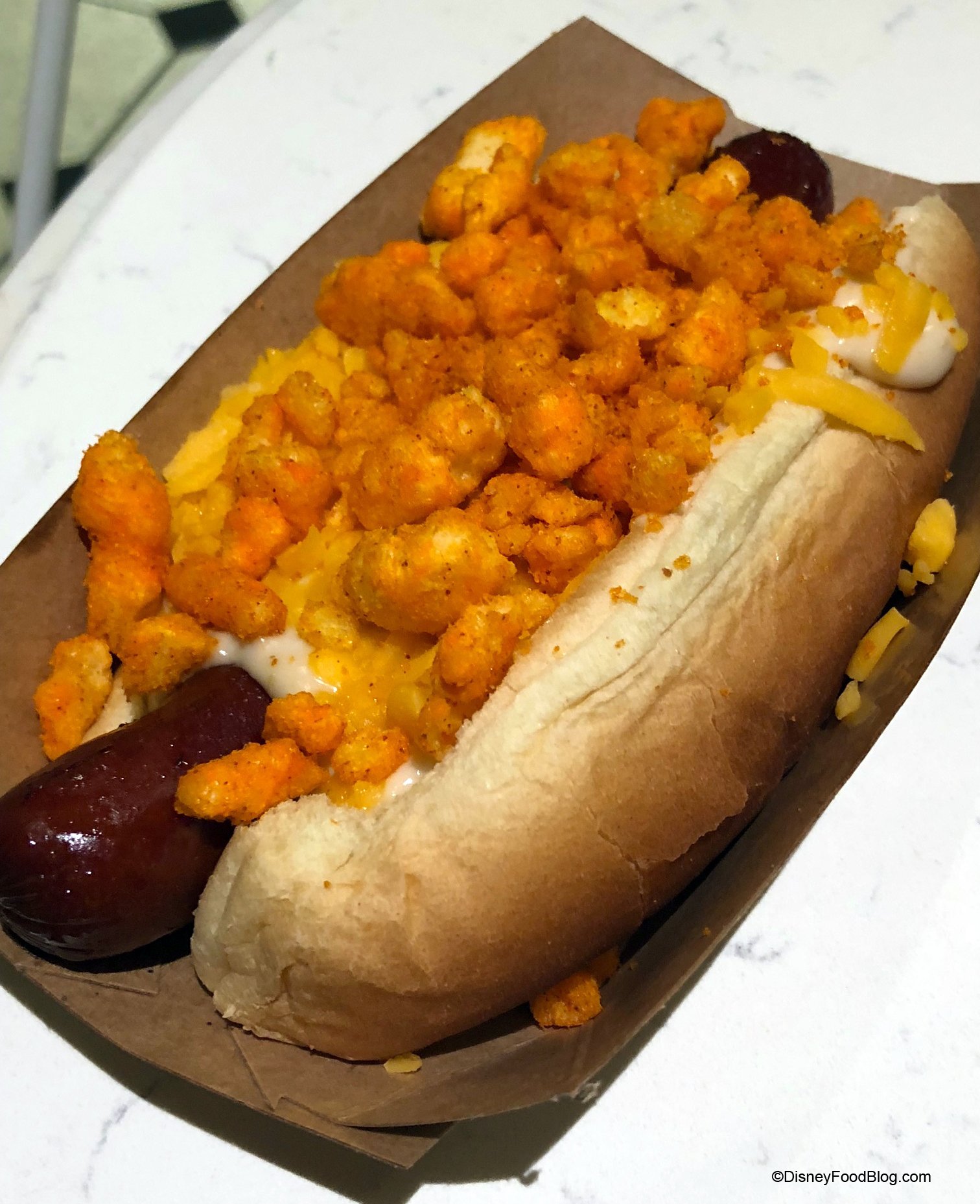 It’s an all-beef hot dog topped with cheddar, queso, and seasoned cheese puffs. And you can get it as a Foot-Long…