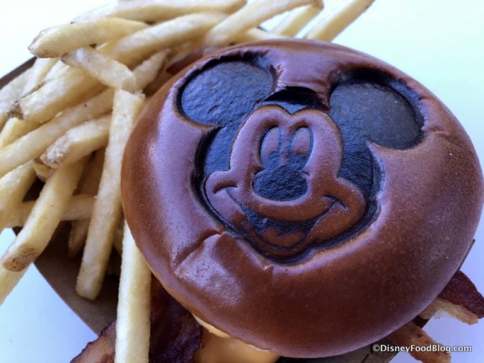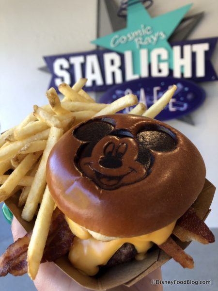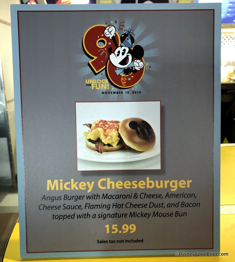 In Tomorrowland, Cosmic Ray’s Starlight Cafe is serving a Mickey Cheeseburger to mark the occasion! This burger is topped with various versions of Mickey’s favorite food: CHEESE!!