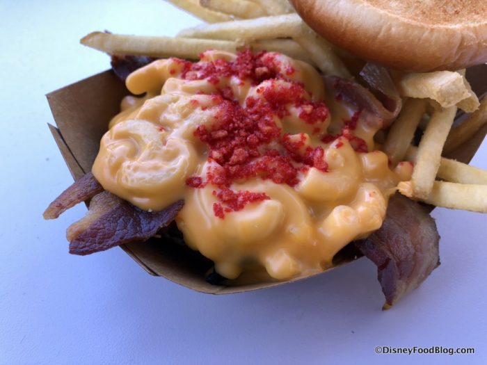 YEP! Topping the burger patty is macaroni and cheese, American cheese, cheese sauce, and spicy cheese dust…