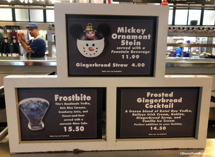 You will find the Flurry of Fun Frostbite and Frosted Gingerbread Cocktails here — plus the must-have Mickey Ornament Stein. You can also sip on Frozen Hot Chocolate here during the season.