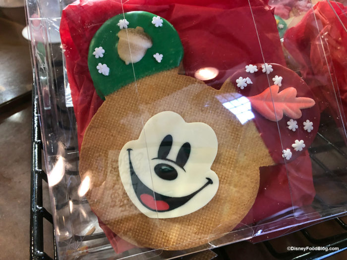 Our stop in the Trolley Car Cafe (Starbucks) was quite seasonal! We spotted another Flurry of Fun eat, a Large Mickey Shortbread Cookie. And this isn’t just one cookie — it’s a shortbread cookie sandwich — our favorite kind of sandwich! It’s filled with raspberry jam.