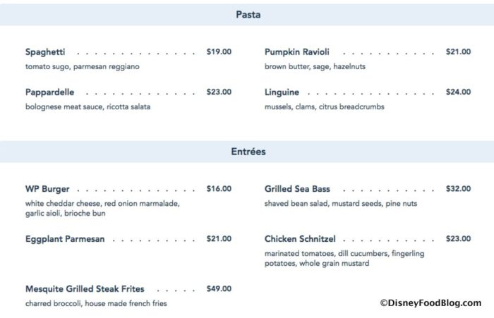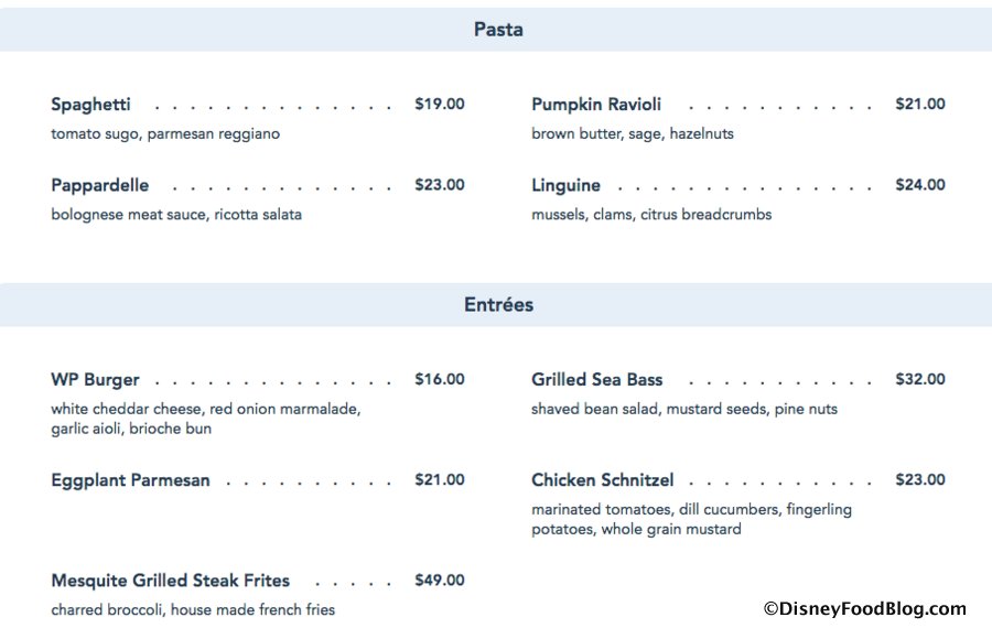 Pasta and Entrees offer a Pumpkin Ravioli and the WP Burger and Chicken Schnitzel.