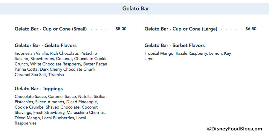 And check out the Gelato Bar offerings… and TOPPINGS LIST!!