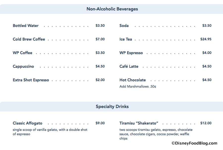 And the beverages appear to be quite varied, from non-alcoholic to unique specialty cocktails like the Tiramisu “Shakerato.”