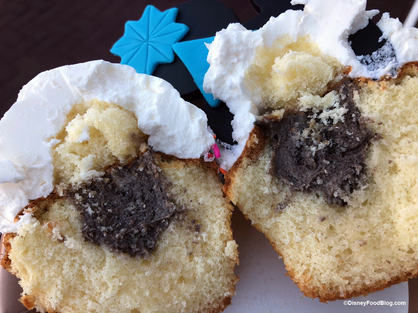 This is a vanilla cupcake filled with a cookies and cream filling and topped with vanilla frosting. Those Mickey ears are chocolate (pretty sure it’s white chocolate that’s been colored black.