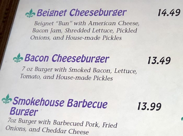 So — here are my thoughts: this burger is a great concept. I love the sweet/savory idea, which has been done a few times before at Disney (one example is the cinnamon bun burger on the All Star Movies secret menu). But the beignet bun was tough and difficult to bite through, which seemed odd (beignets are supposed to be soft — they’re similar to donuts). Maybe it was overcooked.