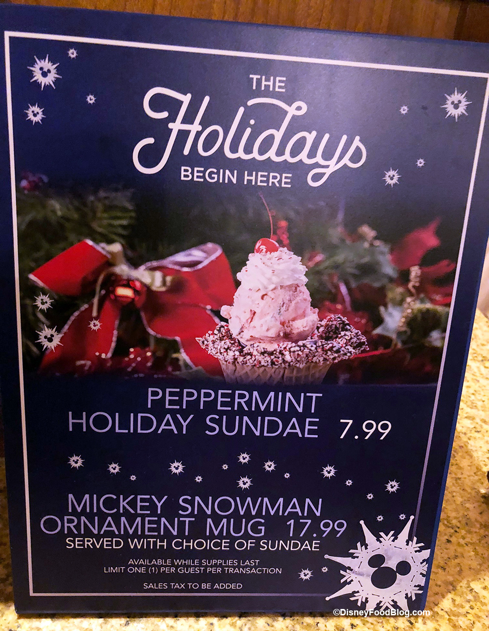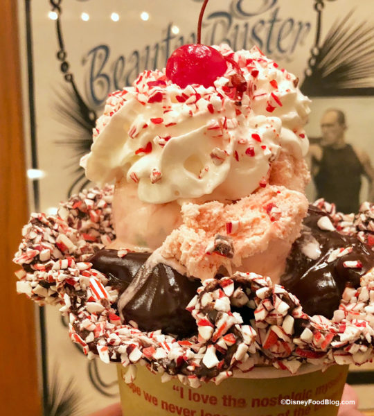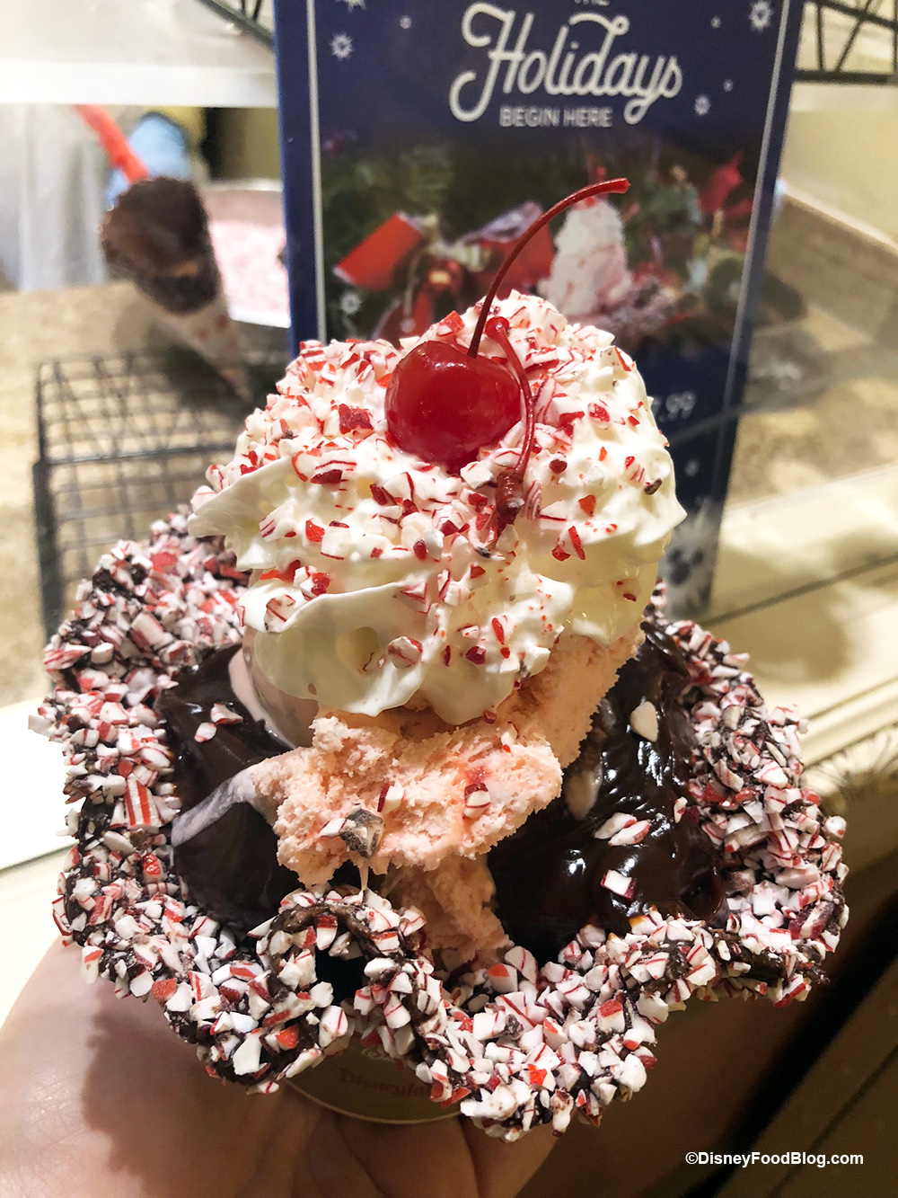 The Peppermint Holiday Sundae is served in a waffle cone bowl that has been dipped in chocolate and garnished with crushed peppermint. (We warned you about the peppermint bomb that exploded in Disneyland!)