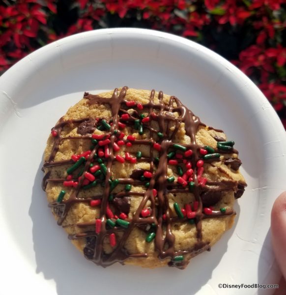 So while we’re game to eat six cookies on any given day, you’ll want to see what you’re in for. Deliciously so. First up, the Red and Green Chocolate Chip Cookie from Feast of the Three Kings. This is a traditional chocolate chip cookie with chocolate drizzle and sprinkles!