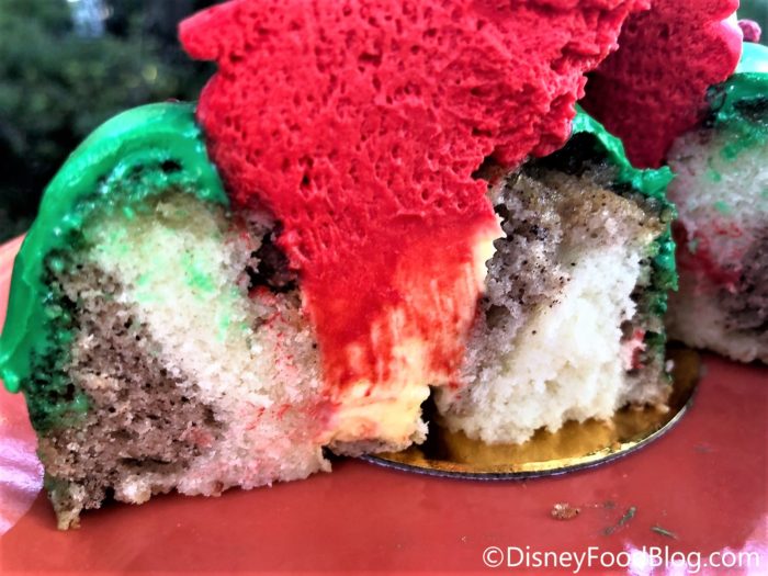 And thank goodness, this cake was fabulous! As the menu states, it’s a cinnamon and candied pecan bundt with a center of crème brûlée. It’s topped with green icing, red chocolate pearls, red whipped mousse and a chocolate piece that features the fanged door wreath from The Nightmare Before Christmas.