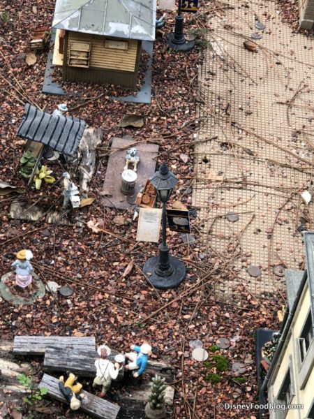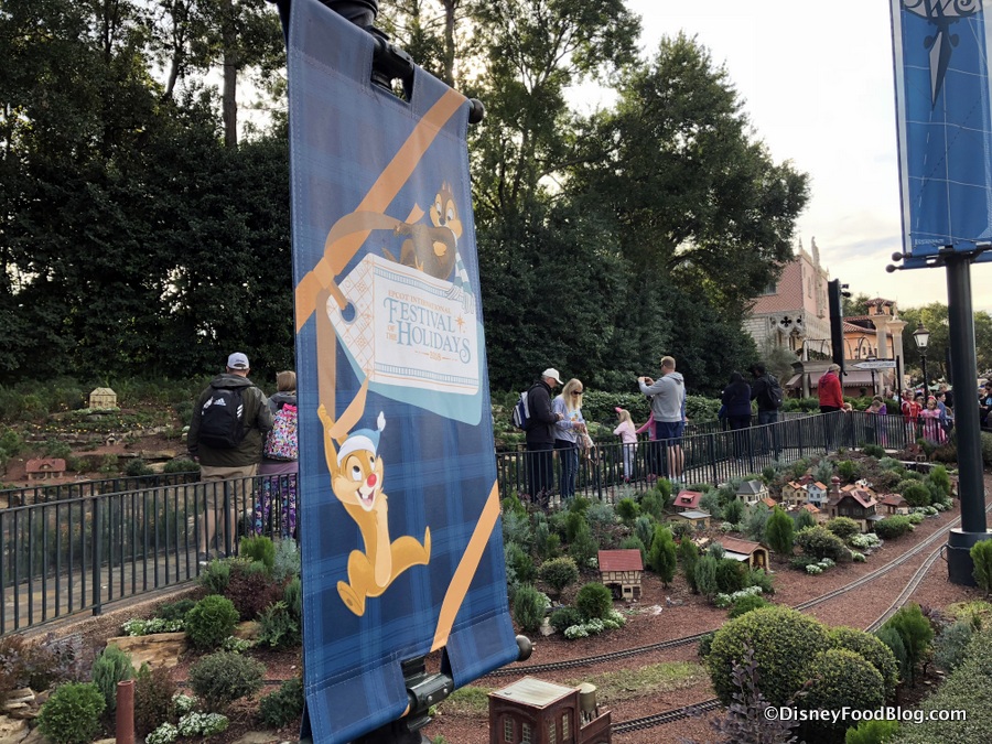 We’re paying a visit to the Train Village and seeing how the miniature town is celebrating the park’s current Festival — the Epcot International Festival of the Holidays — with its own itty bitty Festival of the Holidays banners!