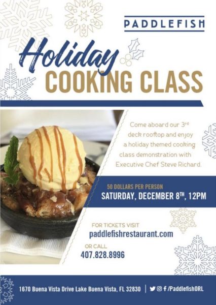 The Holiday Cooking Class at Paddlefish takes place on Saturday, December 8, 2018 from 12:00 – 2:00 PM. Tickets — which are $50 per guest — may be purchased here.