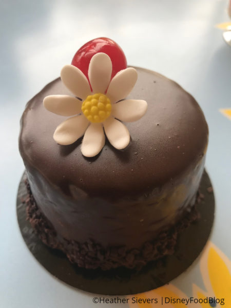 The Chocolate Cake comes with a sweet little daisy topper and a bright red cherry to mimic the design of Mary’s hat.
