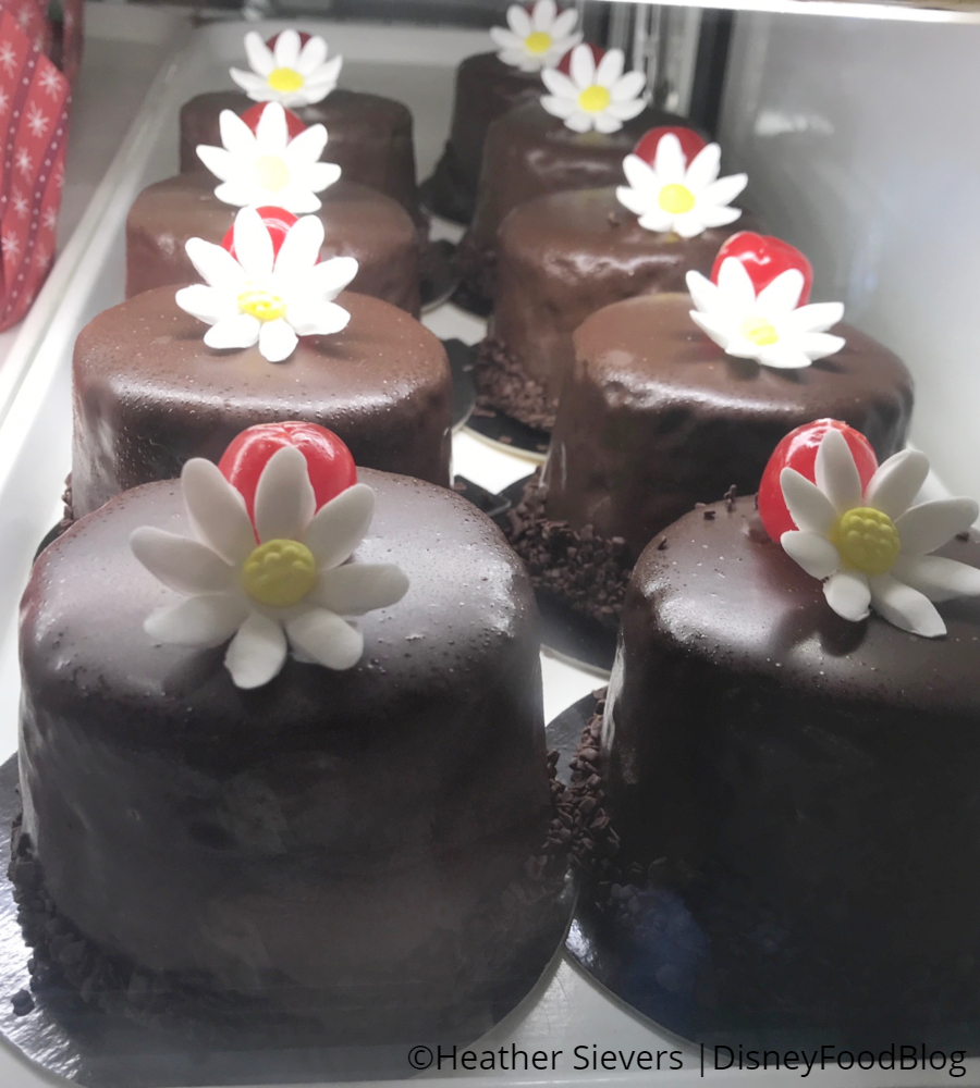 The miniature two-layer cake is coated in rich chocolate ganache. Chocolate fans rejoice!