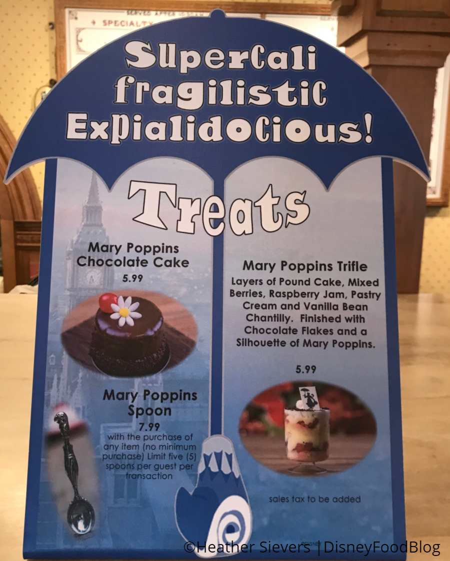Our Disneyland correspondent Heather Sievers (cheerio, @DiningInDisney!) found Mary Poppins Chocolate Cake and Mary Poppins Trifle in the dessert case — along with the option to purchase a souvenir Mary Poppins spoon! Yes, please!