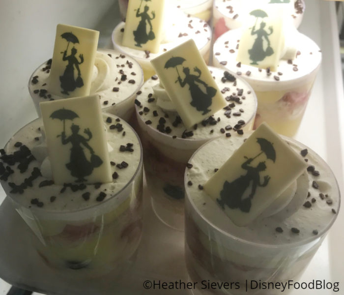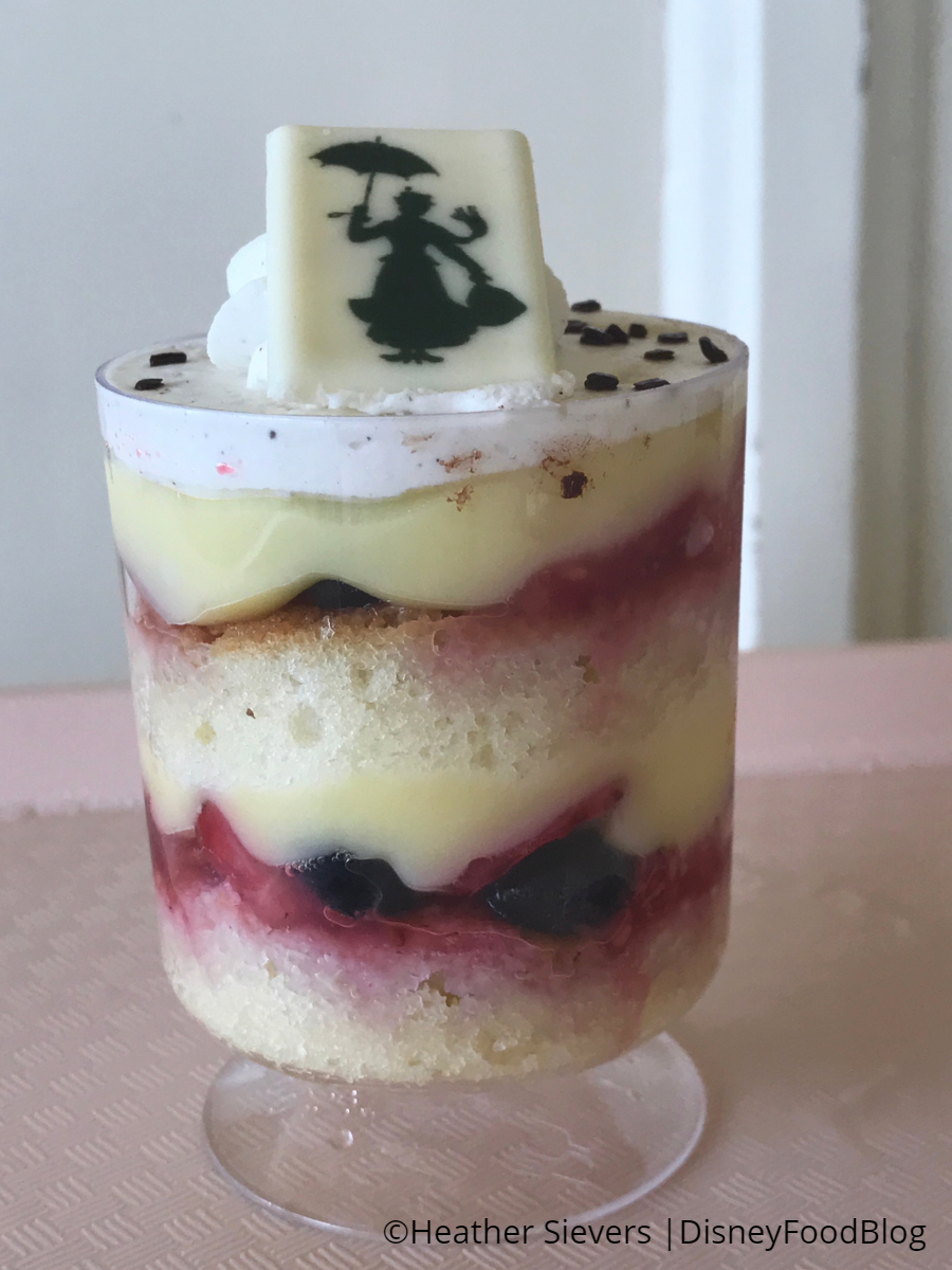 The Mary Poppins Trifle layers pound cake, mixed berries, raspberry jam, pastry cream, and vanilla bean chantilly. The topper is a white chocolate Mary Poppins silhouette.