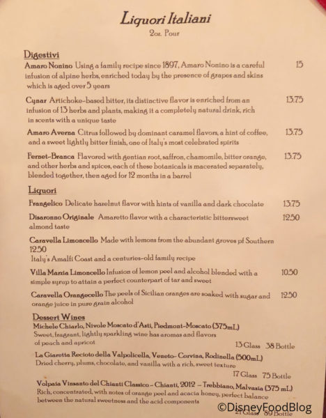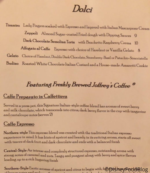 The steak was also cooked to the perfect doneness for me, and it was still juicy. The Oak-Grilled Strip is a great (if not typically Italian) entree here, but if you’re in the market for steak, there are better to be found in Disney World — check out Shula’s Steakhouse, Yachtsman Steakhouse, and Le Cellier Steakhouse.