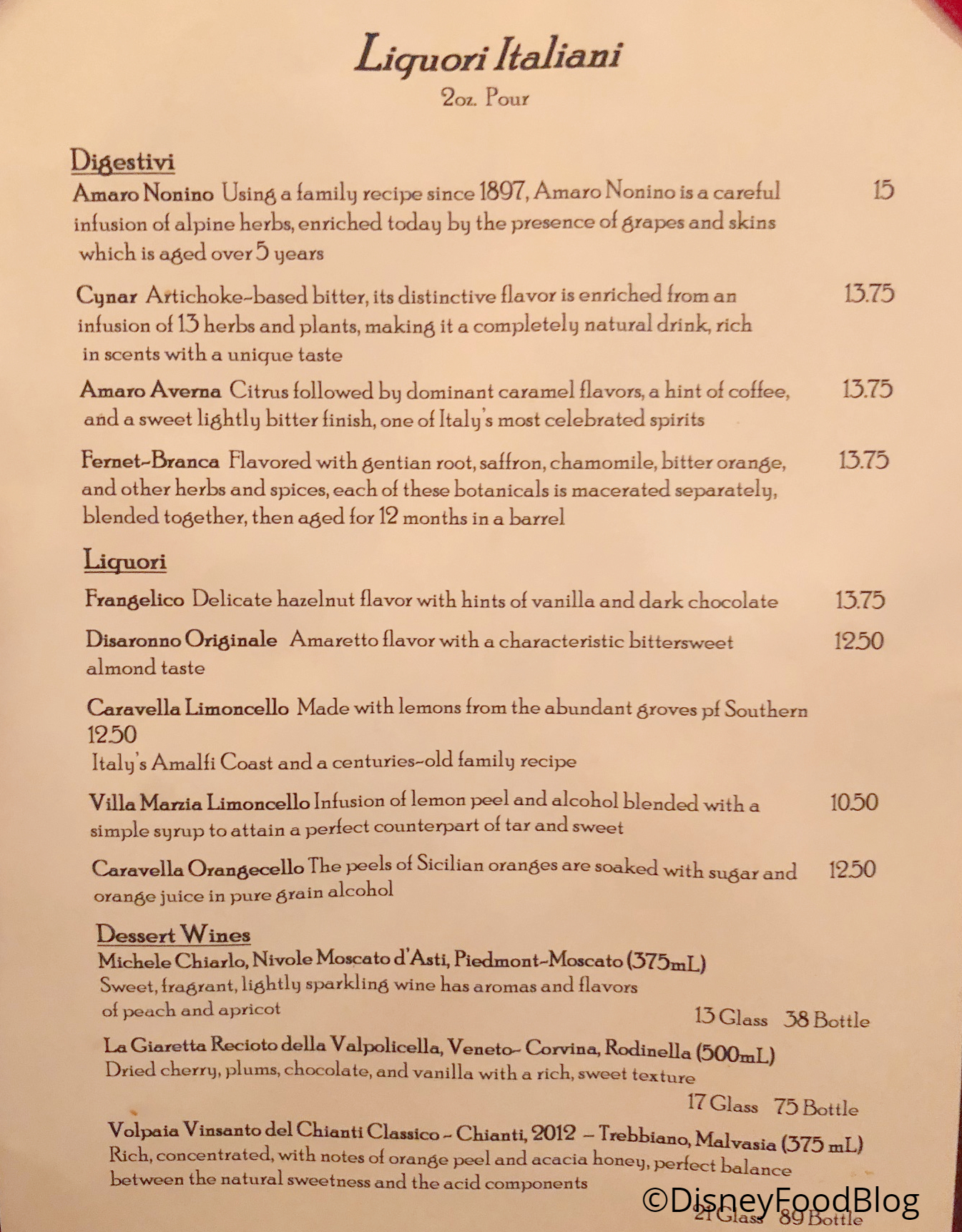 If you’re looking for a unique Italian drink, check out the Liquori Italiani at the end of the meal for digestives, liqueurs, and dessert wines.