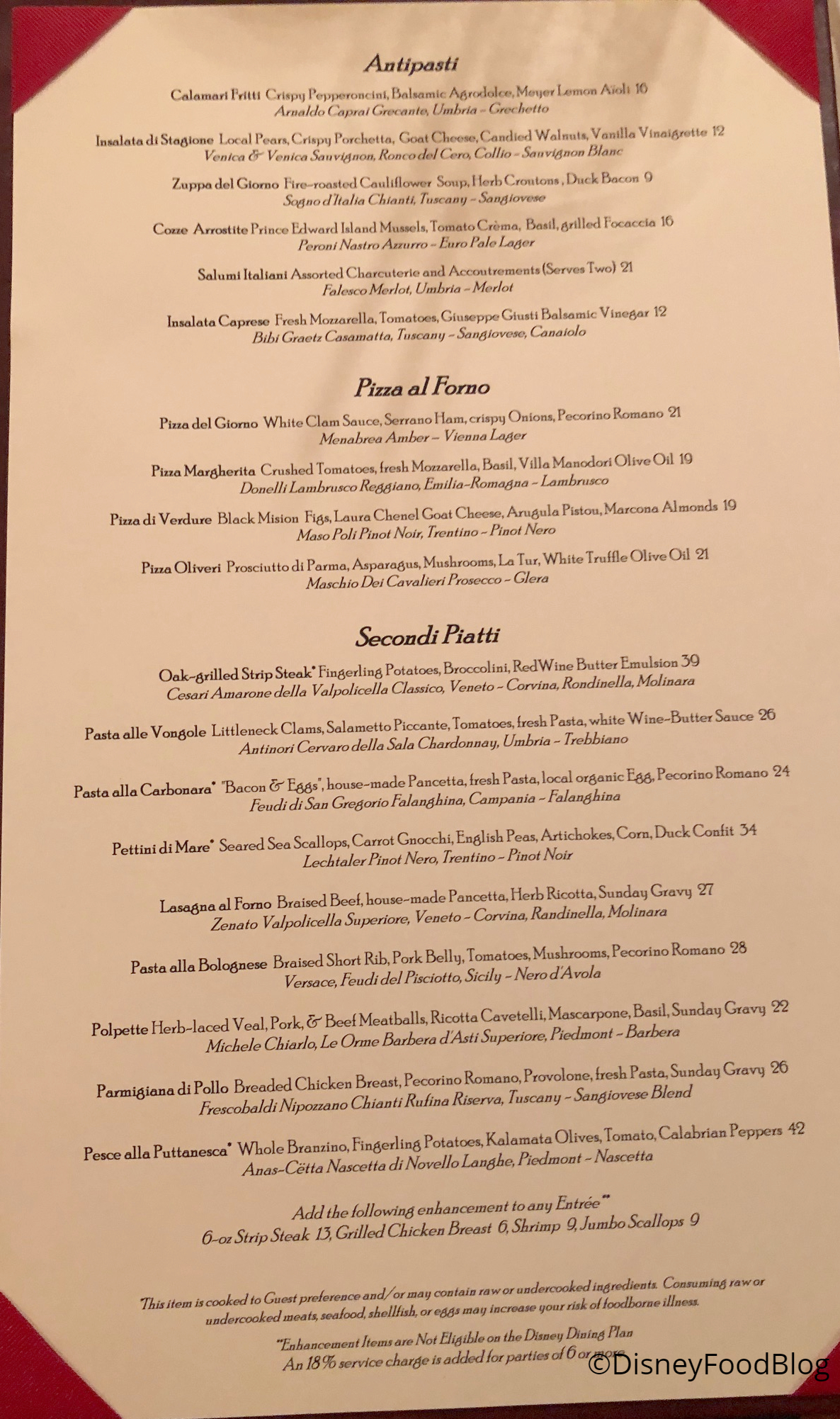 Trattoria al Forno is an Italian restaurant, but from our first visit, the menu included both classic preparations and new takes on traditional cuisine. The drink menu is similar in that diners can find Disney World favorites like the Magical Star Cocktail alongside slightly twisted drinks like the Italian Manhattan.