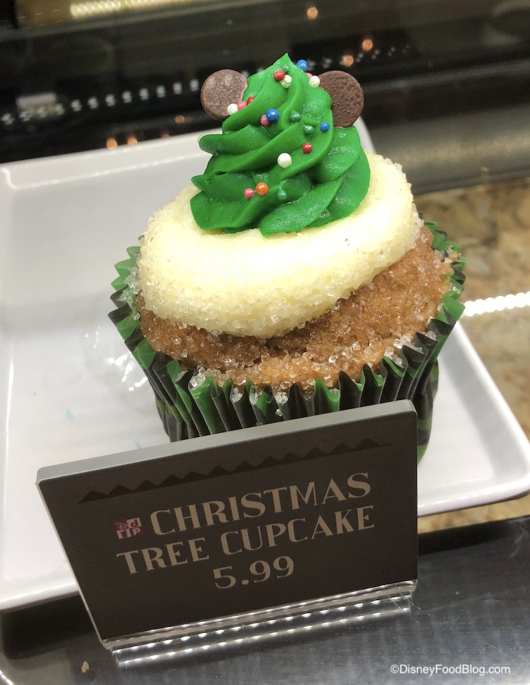 The Christmas Tree Cupcake features gingerbread cake, cream cheese frosting, crunchy sugar snow, and a buttercream Christmas tree topped with chocolate Mickey ears.
