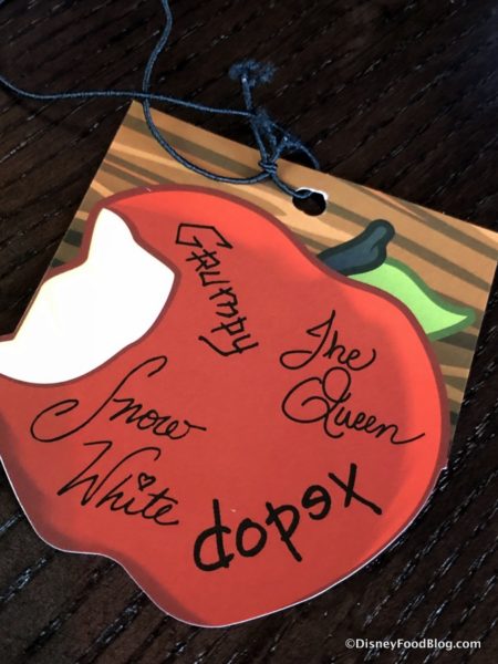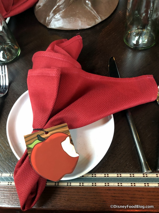 Something to note: when guests are seated at the tables, they’ll find a character signature card at each setting (this is the “enchanted apple” I mentioned earlier).