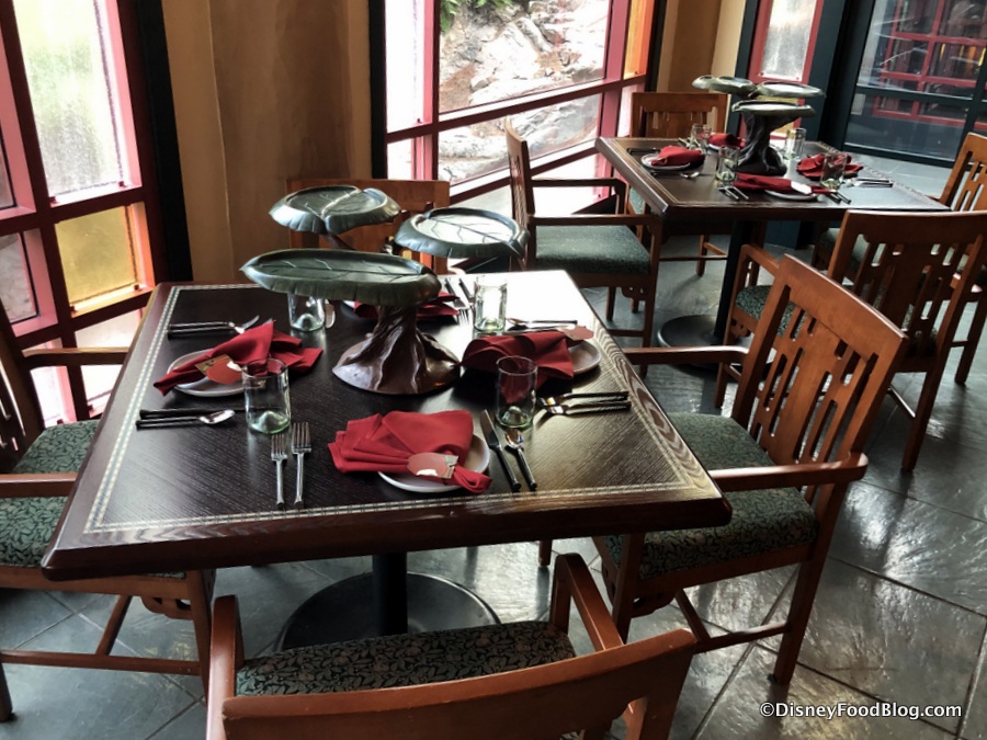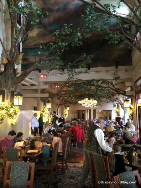 Artist Point has been transformed into the Enchanted Forest from Snow White and the Seven Dwarfs for this new character meal. If you’ve previously dined at Artist Point, you’ll recognize lots of elements of the decor such as the room’s signature lanterns hanging high above.