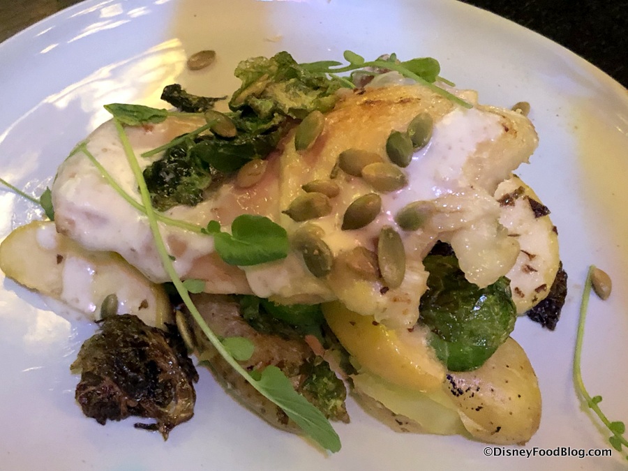The Brother’s Grimm Roasted Chicken is served with confit potatoes and roasted Brussels sprouts.