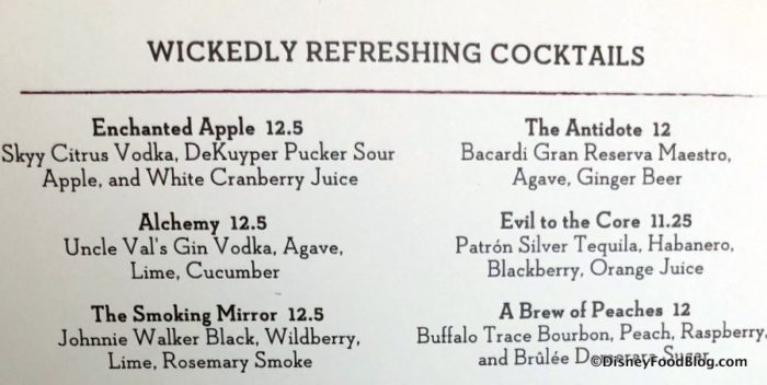 We’ll be diving into those shortly, but let’s start with a look at the drinks. Of-age guests may select a “Wickedly Refreshing Cocktail.” (For guests paying out of pocket — as opposed to using the Disney Dining Plan who will have one included — these drinks range from an additional $11.25 – $12.50.)
