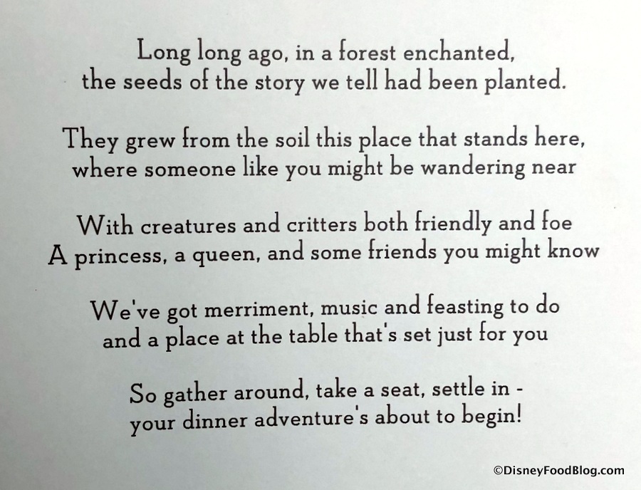 We went last night and loved it! Everyone loved the food, especially. Just wanted to let you that they appear to be changing some of the offerings. Besides the mushroom bisque that was already mentioned in the comments, the Hunter’s Pie is now a Hunter’s Terrine (like a pate). And the Stew is now a beef stew instead of a seafood stew. Thanks for reviewing, it convinced us to go even though we usually don’t do character meals.