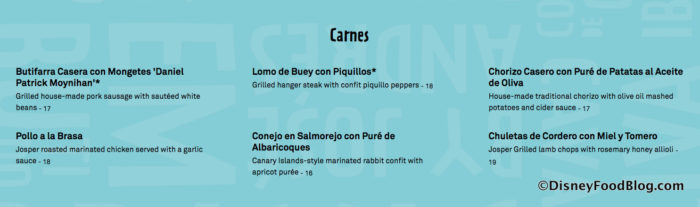 Carnes selections feature chicken, a house-made pork sausage, grilled hangar steak, rabbit confit, and more.