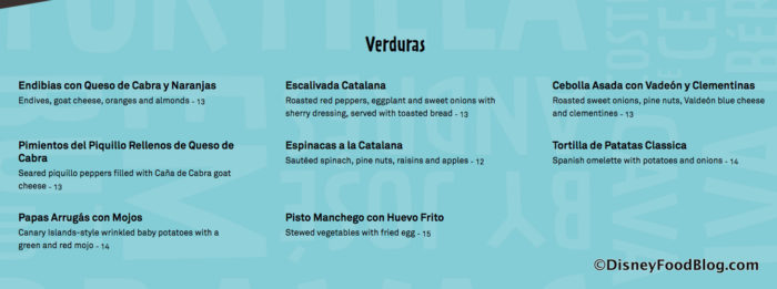 Veggies include a wide range from Stewed Vegetables with a fried egg to Canary Islands-style wrinkled baby potatoes with a green and red mojo and beyond.