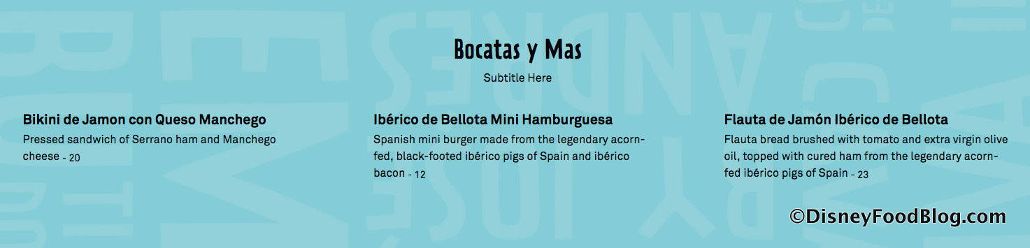 Sandwiches include a “Spanish mini burger made from the legendary acorn-fed, black-footed ibérico pigs of Spain and ibérico bacon.”