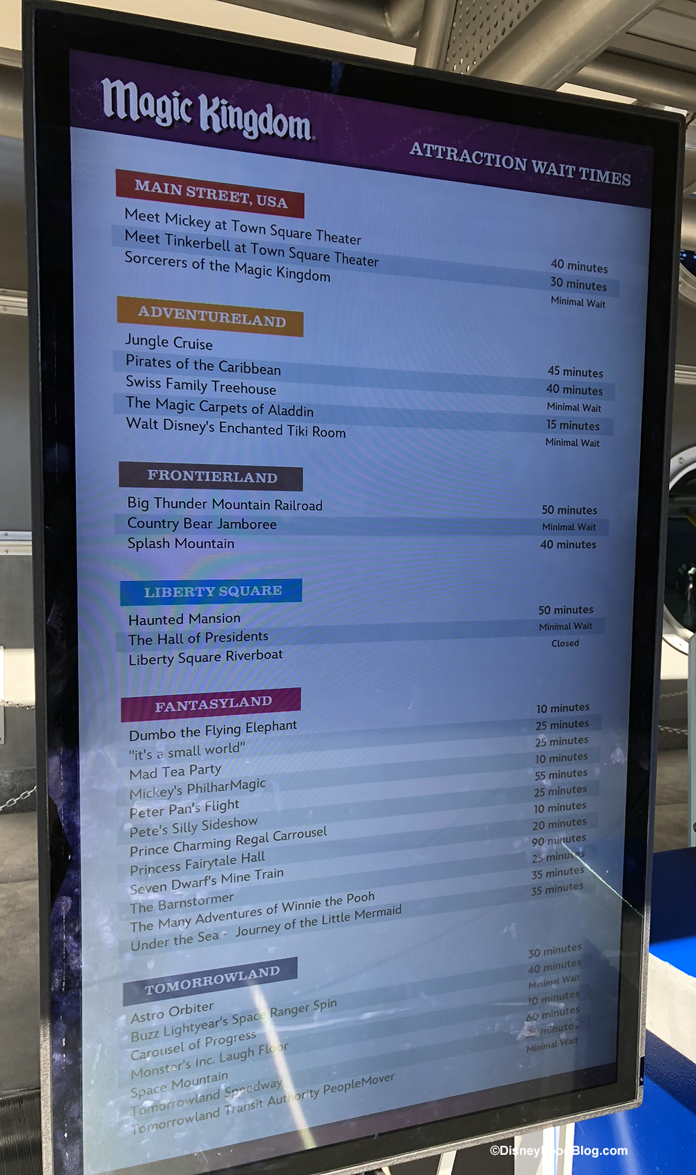 In addition to serving as a base for Cast Members who can assist with questions and information about the park, this kiosk also has a digital wait times display.