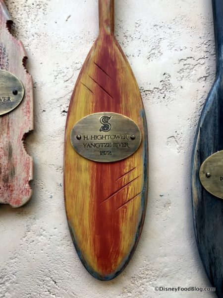 As you continue in your wanderings, you’ll want to be sure to check out the paddles lining the wall which represent member of the Society of Explorers and Adventures. (You can learn more about S.E.A. by reading about the Jungle Skipper Canteen in Walt Disney World here.)