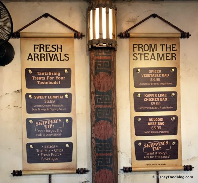 These soft buns are truly excellent, and clearly unique from what you’ll find at most counter service spots in Disneyland. You can’t go wrong with any of the flavorful fillings. That said, you’ll still see a Skipper’s Tip on the menu: “Want it spicy? Ask for the sauce!”