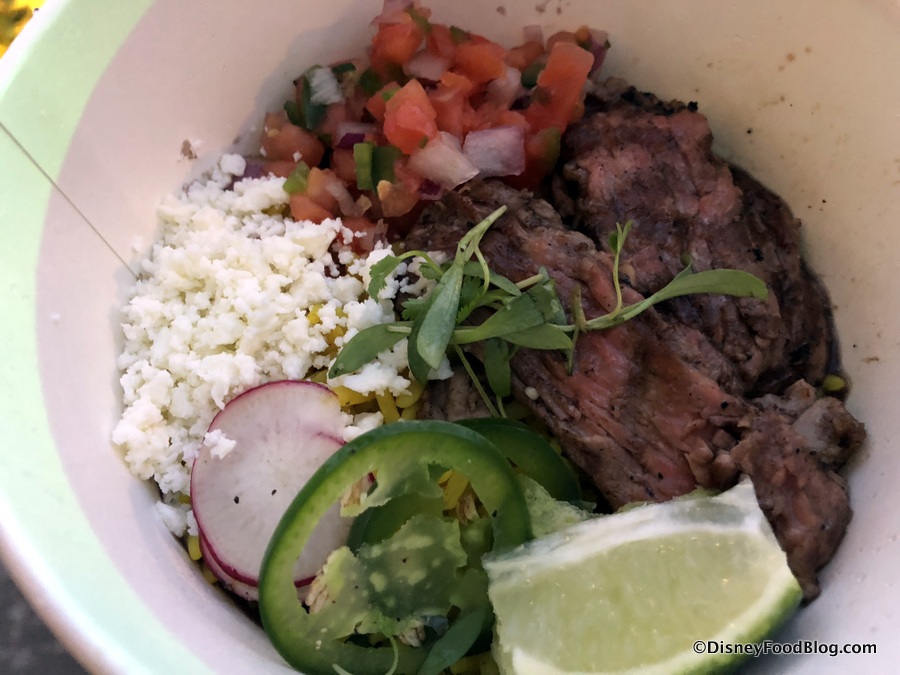 What stands out at Springs’ Street Tacos — and this is typical from our visits to the Disney Food Trucks — is the super fresh quality of the ingredients, giving everything a nice, bright flavor and zip. The Steak Bowl is no exception.