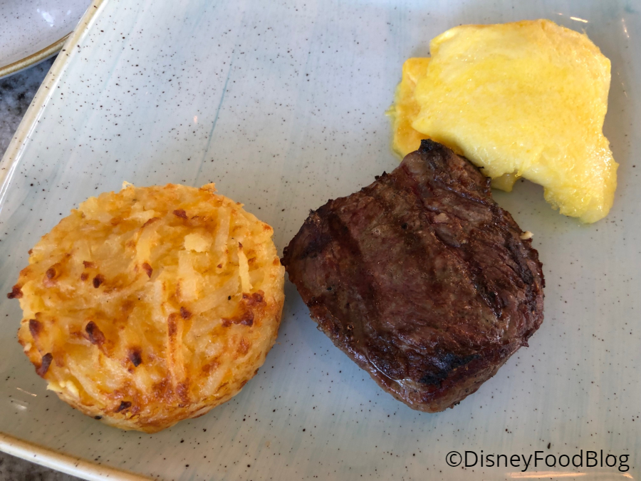 My table started with a fairly traditional breakfast: Steak and Eggs. There’s not much to say about the plating here; it’s boring and not cohesive. At all. But the Sirloin Steak, Cheesy Hash Brown Casserole, and Eggs were decent. The House-Made Steak Sauce was flavorful, but overall, this was pretty ho-hum.