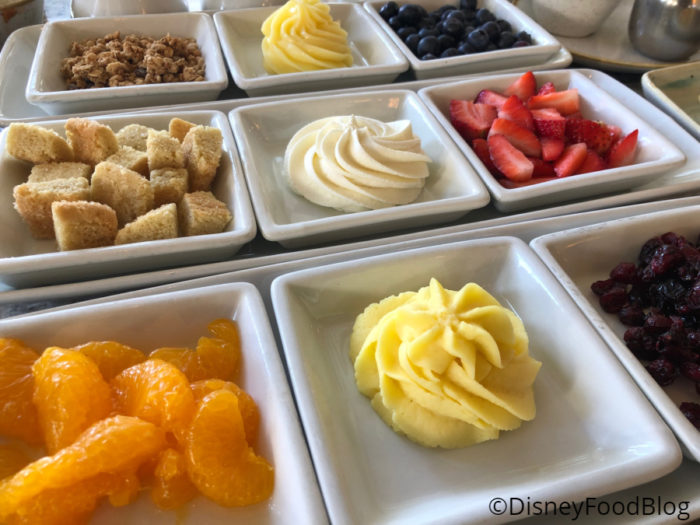 If you opt for a (Disney) traditional Mickey Waffle or Pancakes, you’ll be offered the choice of adding on some toppings and a specialty syrup for $3.50. And, well, you know me and toppings/sauces: GET ‘EM ALL. Sooooo I ordered all three of the topping options to go with my Mickey Waffle!