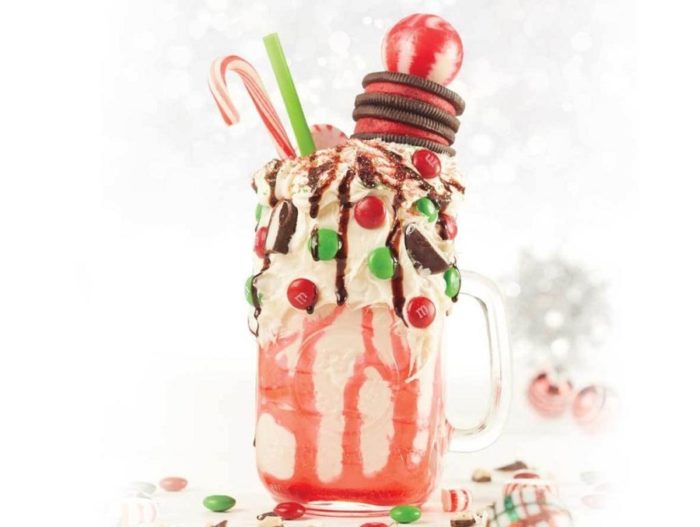 A vanilla milkshake is poured over with raspberry sauce and topped with vanilla icing, chocolate syrup, peppermint patties, winter Oreos, M&Ms, and not one, but TWO full pieces of candy: a peppermint lollipop and a candy cane!