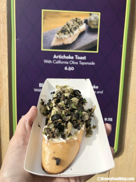 - Artichoke Toast with California Olive Tapenade – $6.50