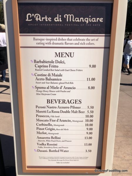 2019 Epcot Festival of the Arts L’Arte di Mangiare Menu