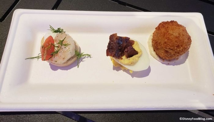 - Gallery Bites: A Trio of Hors d’Oeuvres: Chilled Shrimp with Cucumber Cream Cheese on a Crostini; Traditional Deviled Egg with Candied Bacon; and Crispy Truffled Risotto Ball with Truffle Aïoli (V) – $7.50, DDP Snack Eligible