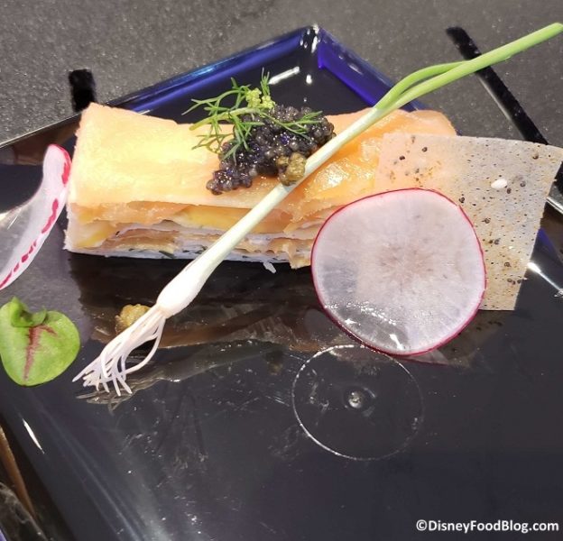 - Smoked Salmon and Cream Gâteau with Egg Yolk Cream, Paddlefish Caviar, and Micro-herbs – $7.00, DDP Snack Eligible