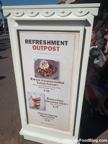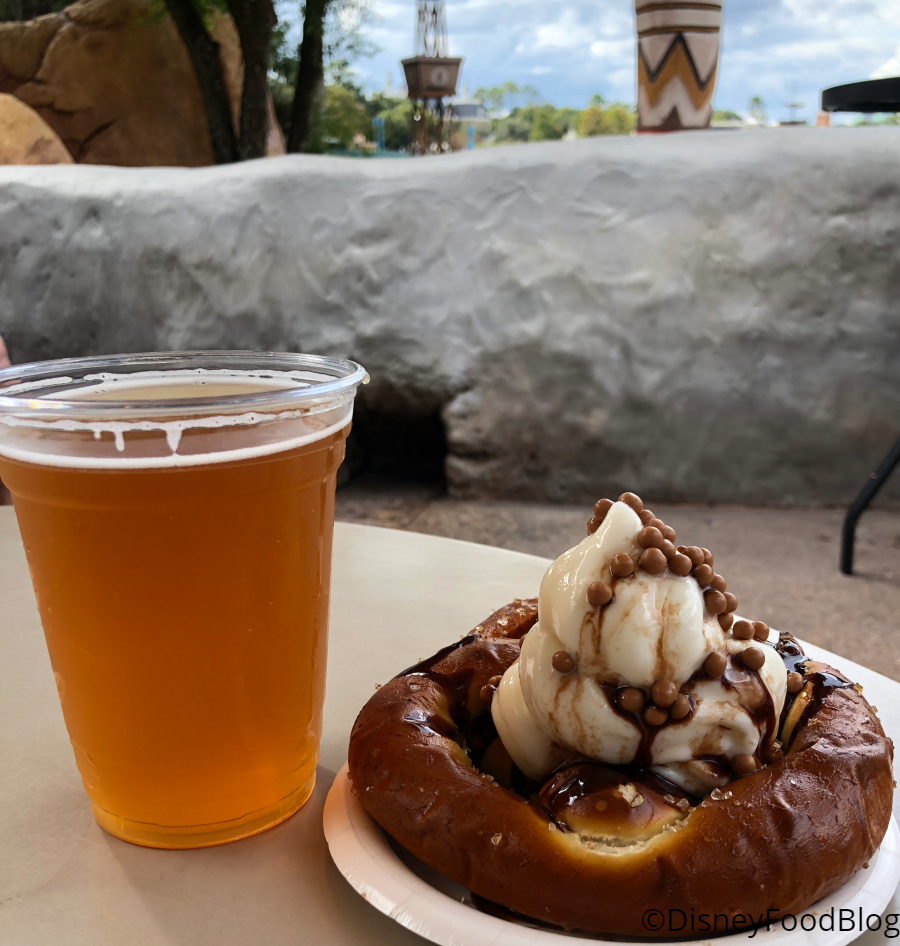 - Warm Caramel-Stuffed Salted Pretzel with Soft-Serve Ice Cream and Chocolate Sauce (kid-approved) – $8.25, DDP Snack Eligible