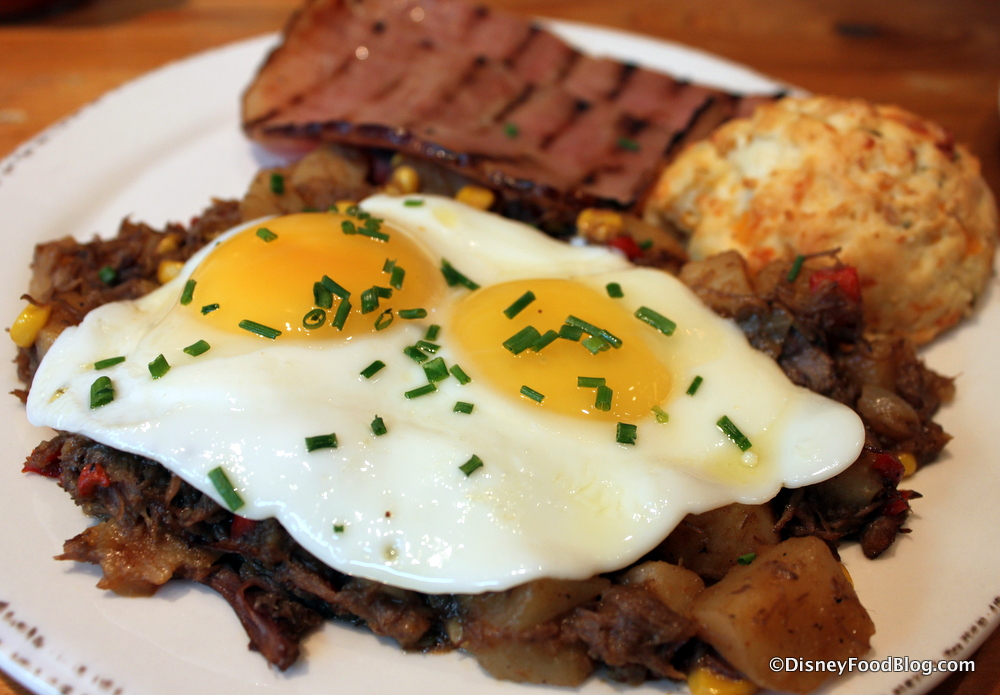 Next up: the Short Rib Hash ($22). Ridiculously tender, oh-so-flavorful short rib, grilled corn succotash, potatoes, red bell peppers, Fresno peppers, and two sunny-side up eggs. Comes with one of Homecomin’s famous Cheddar Drop Biscuits.