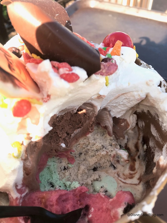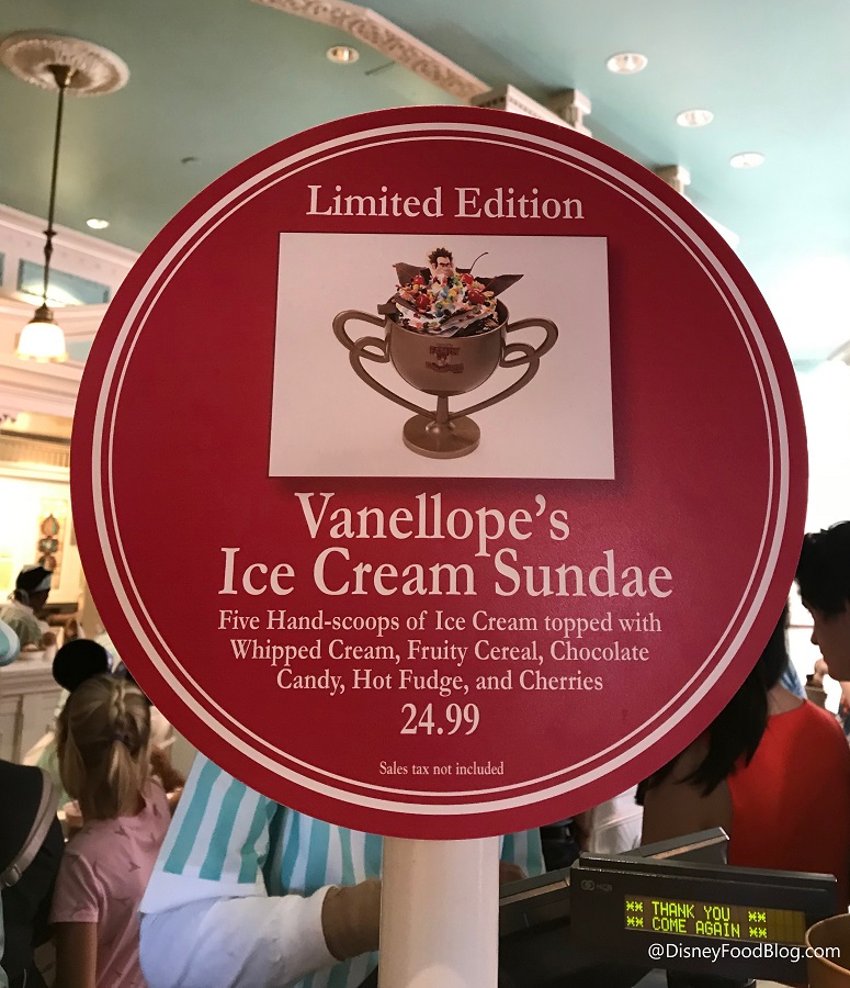 My husband, myself, and our 19 year old son tried the Vanellope sundae on 1/2/19. It was a lot of ice cream, but we really enjoyed it! I was not sure about the cereal (basically fruity pebbles), but turns out, it was a nice addition. It was a fun ending to the last night of our holiday trip.