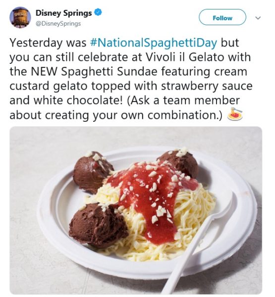So, if you missed National Spaghetti Day (it was January 4th), Disney Springs and Vivoli il Gelato are here to remind that you can still grab a plate of spaghetti to celebrate!